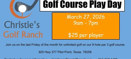 Christie's Golf Ranch is a one-of-a-kind golf driving range and 9 hole, par 3 golf course nestled in the center of horse country in Pilot Point, Texas. This unique golf facility has been the life-long dream of golf enthusiast, Jeff Christie. Jeff purchased the land in 2008 and began construction on the state of the art venue named in honor of his late father, Jim Christie.